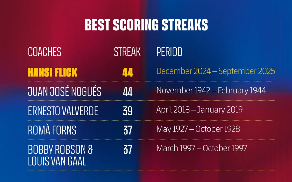 Tento rekord držala od 40. rokov Barcelona vedená trénerom Juanom José Noguésom, ktorá medzi 22. novembrom 1942 a 6. februárom 1944 skórovala v rovnakom počte zápasov za sebou. Ani Cruyffov "Dream Team“, ani generácia s Lionelom Messim nedokázali tento zápis prekonať.